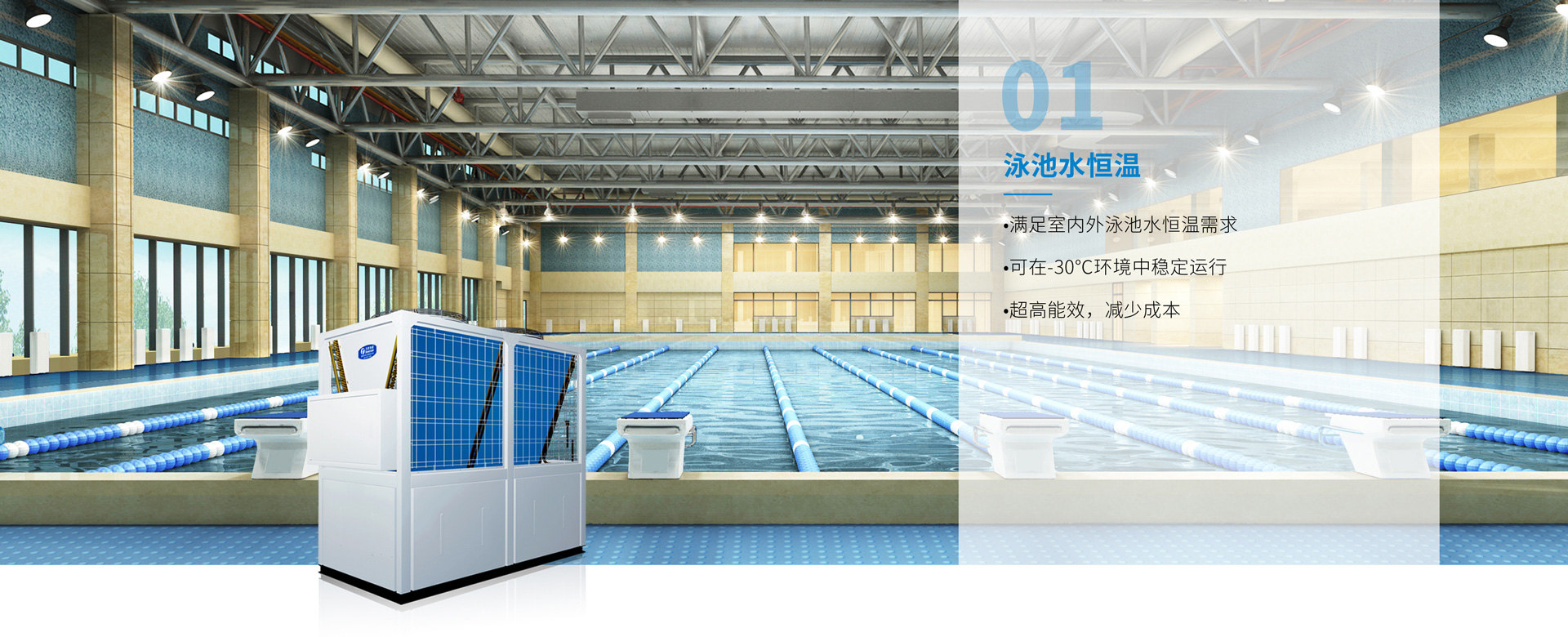 比賽游泳池對水溫要求較高,天舒泳池熱泵系統不僅能精確的控制水溫,而且相比傳統的加熱方式,可節約80%運行費用。